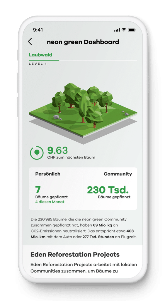 - pro CHF 100 Kartenumsatz mit deiner neon green-Mastercard wird ein Baum gepflanzt