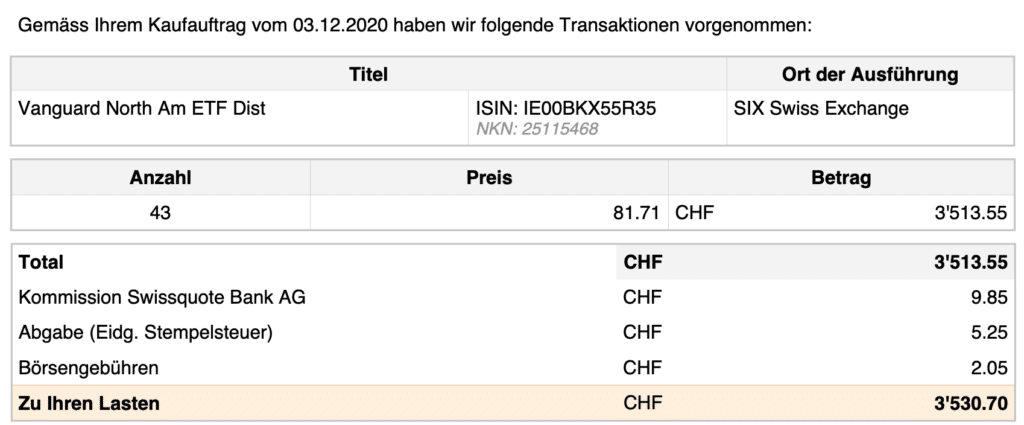Unten findest du einen Ausschnitt einer Börsenabrechnung für den Kauf eines Indexfonds von mir. Und daneben die Börsenabrechnung für einen Kauf eines ETFs in ungefähr gleicher Höhe. So kannst du vergleichen, welche Gebühren und Steuern beim jeweiligen Wertpapier anfallen oder eben nicht. Übrigens habe ich für den Kauf von Wertpapieren bei Swissquote keine Sonderkonditionen. Bei dir sähe die Abrechnung genau gleich aus.
